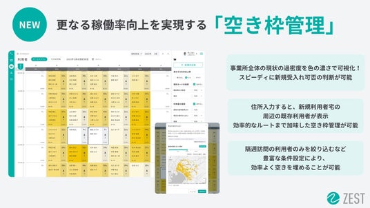 在宅医療・介護の収益改善プラットフォーム「ZEST」を展開する株式会社ゼスト(本社:東京都新宿区、代表取締役社長:一色淳之介)は、これまでのサービス提供の中で培った在宅医療・介護事業の経営・運営に関するノウハウを活かし、今後は収益改善プラットフォームとして進化し、業界貢献を加速させることを宣言いたします。その第一弾として、ステーションの稼働率向上に貢献する新機能「空き枠管理」をリリースしたことをお知らせいたします。