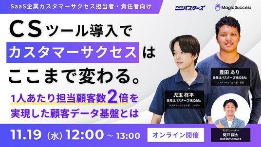 既存顧客営業に特化したカスタマーサクセスプラットフォーム「MagicSuccess(マジックサクセス)」を提供する株式会社UPDATA(本社:東京都港区、代表取締役:岡村雅信)は、2025年11月19日(木)に、カスタマーサクセス担当者向けのCSツール活用事例ウェビナーを開催いたします。