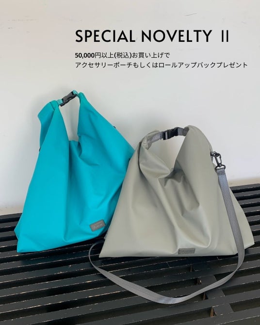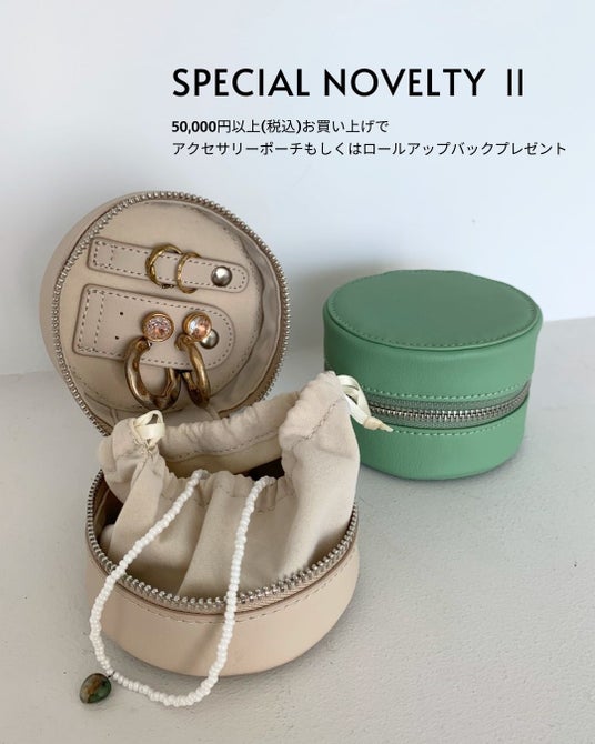 - 税込50,000円以上ご購入の方に、アクセサリーポーチまたはロールアップバッグをプレゼント