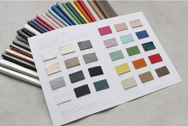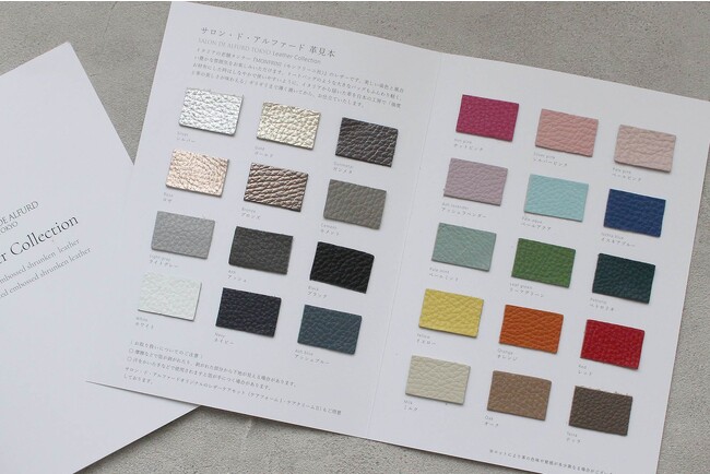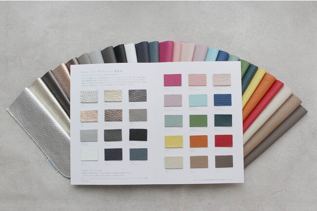 サロン・ド・アルファードで採用しているイタリアンシュリンク型押しレザーで仕立てたペンケースと、24色のレザーサンプル帳のセット。ペンケースは24色展開。