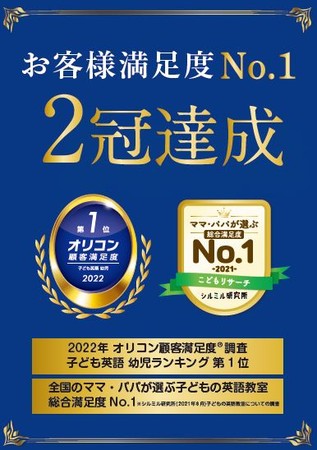 「子ども英語 幼児」ランキングにおいて、2020年につづく2度目の満足度総合第1位を獲得。過去5年以内に半年以上お通いいただきましたお客様からの満足度で第三者機関を通じで高い評価をいただきました。