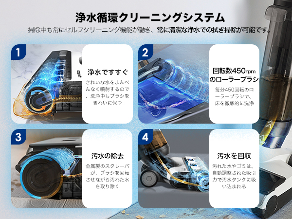 掃除中も常にブラシクリーニング機能が働き、常に清潔な浄水での拭き掃除が可能。ブラシが汚れを床に広げる心配もありません。