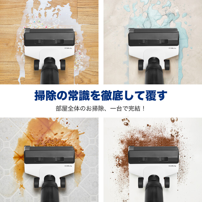 吸引と水拭き掃除を同時に実施。本体のメイン機を取り外すことでハンディ掃除機(吸引)にも切り替え可能です。乾湿ゴミどちらも対応するため、家全体の掃除がこれ1本で可能になりました。また、ボタンひとつで多様な掃除モードに切り替えて、様々なシーンの掃除ニーズに対応します。
