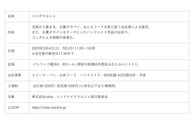 年間3,000件のイベント事業を手掛ける株式会社トーガシ(本社:東京都江戸川区、代表取締役 吉田守克)は、2023年3月4日(土)~3月5日(日)にパシフィコ横浜(所在地:神奈川県横浜市)にて初開催される、日本最大級のお菓子とパンの祭典「cottaマルシェ」の会場施工をサポートいたします。