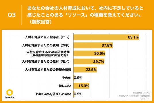 「Q3.あなたの会社の人材育成において、社内に不足していると感じたことのある「リソース」の種類を教えてください。(複数回答)」(n=111)と質問したところ、「人材を育成できる指導者(ヒト)」が63.1%、「人材を育成するための費用(カネ)」が37.8%、「人材を育成するための研修時間(事業部が育成に非協力的)」が30.6%という回答となりました。
