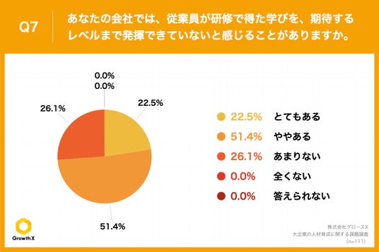 Q6で「研修は一切行っていない/答えられない」以外を回答した方に、「Q7.あなたの会社では、従業員が研修で得た学びを、期待するレベルまで発揮できていないと感じることがありますか。」(n=111)と質問したところ、「とてもある」が22.5%、「ややある」が51.4%という回答となりました。