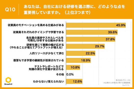 Q6で「研修は一切行っていない/答えられない」以外を回答した方に、「Q10.あなたは、自社における研修を選ぶ際に、どのような点を重要視していますか。(上位3つまで)」(n=111)と質問したところ、「従業員のモチベーションを高める仕組みがある」が45.9%、「従業員それぞれのタイミングで学習できる」が39.6%、「各社員の進捗やスキルレベルを可視化/分析する仕組みがある」が37.8%という回答となりました。