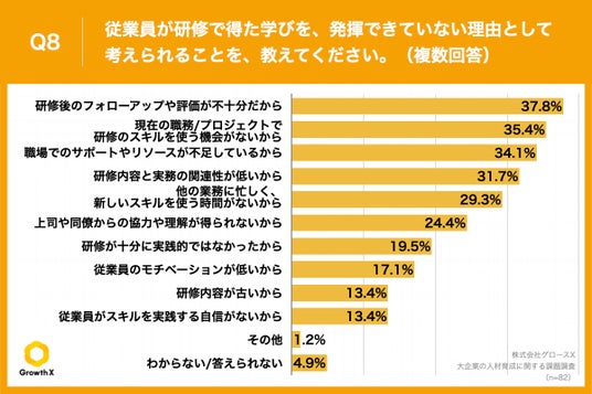 Q7で「とてもある」「ややある」と回答した方に、「Q8.従業員が研修で得た学びを、発揮できていない理由として考えられることを、教えてください。(複数回答)」(n=82)と質問したところ、「研修後のフォローアップや評価が不十分だから」が37.8%、「現在の職務/プロジェクトで研修のスキルを使う機会がないから」が35.4%、「職場でのサポートやリソースが不足しているから」が34.1%という回答となりました。