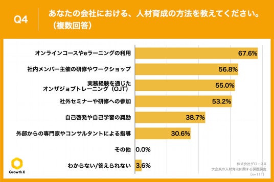 「Q4.あなたの会社における、人材育成の方法を教えてください。(複数回答)」(n=111)と質問したところ、「オンラインコースやeラーニングの利用」が67.6%、「社内メンバー主催の研修やワークショップ」が56.8%、「実務経験を通じたオンザジョブトレーニング(OJT)」が55.0%という回答となりました。