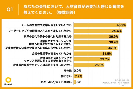 「Q1.あなたの会社において、人材育成が必要だと感じた瞬間を教えてください。(複数回答)」(n=111)と質問したところ、「チームの生産性や効率が低下していたから」が43.2%、「リーダーシップや管理職のスキルが不足していたから」が39.6%、「業界の変化や競争の激化に対応するため」が36.9%という回答となりました。