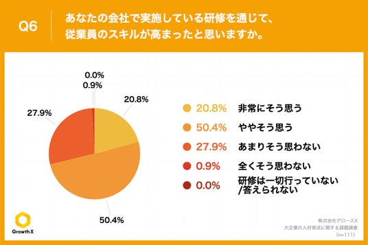 「Q6.あなたの会社で実施している研修を通じて、従業員のスキルが高まったと思いますか。」(n=111)と質問したところ、「非常にそう思う」が20.8%、「ややそう思う」が50.4%という回答となりました。