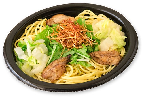 ガーリックを効かせたパンチのある味わいの和風パスタです。香ばしいねぎ塩チキン・キャベツ・白菜・水菜・白髪ねぎをトッピングしました。
