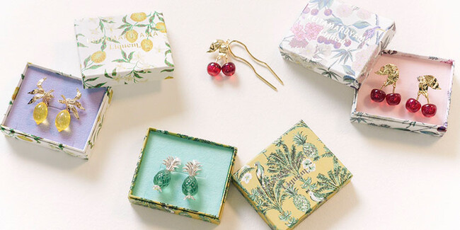 KEITA MARUYAMA公式オンラインストア、丸山邸 MAISON de MARUYAMA、MAISON de MARUYAMA 神戸別邸で販売するフルーツアクセサリーは、すべて元となったKEITA MARUYAMAオリジナルテキスタイル柄のペーパーBOX入り。