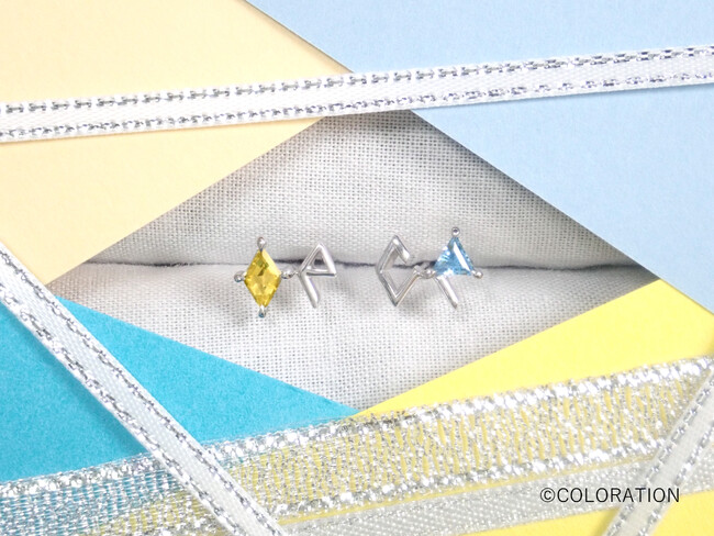カラーレーションリングとカラーレーションピアスは、カラーレーションのロゴをモデルにした、ボーカル組と作詞作曲組の2タイプ。各キャラクターのイメージカラーに合わせた天然石をセットしています。