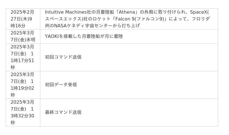 当初、月着陸船は月に対して垂直な姿勢での着陸を目指していましたが、月の表面に横向きに着陸したことから、月着陸船の最大活動時間を考慮しIntuitive Machines社から各ペイロードに、それぞれのミッションを着陸直後から短時間で遂行する指示が発せられました。YAOKIは、着陸の約5日後に計画していたミッションを、着陸直後に実行する計画変更の指示を受け、Athenaに搭載されている全てのペイロードの最後にミッションを実行しました。電力供給の制限や温度の低化など、時間が経つほど環境が悪化する状況下で、月面での写真撮影・データ送信に成功しました。着陸船から月面に解放されるに至らなかったものの、YAOKIが月面で予定していた所定の動作が正常に作動することを確認しました。