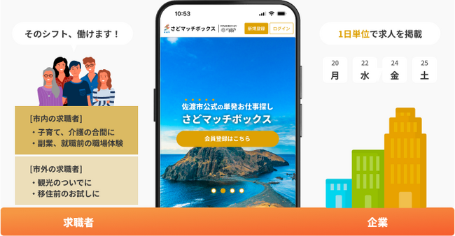 佐渡市は佐渡市内を就業地とする求人がまとめて掲載されるギグワークプラットフォーム「さどマッチボックス」とアプリケーションを提供します。利用企業はサイトおよびアプリケーション上に簡単に求人を出すことができ、働き手はサイトやアプリケーション上から好きな仕事を短期単発から選ぶことができます。企業のプラットフォームへの求人掲載料は無料で、給与額の19%の採用手数料および給与振込の手数料がかかります。
