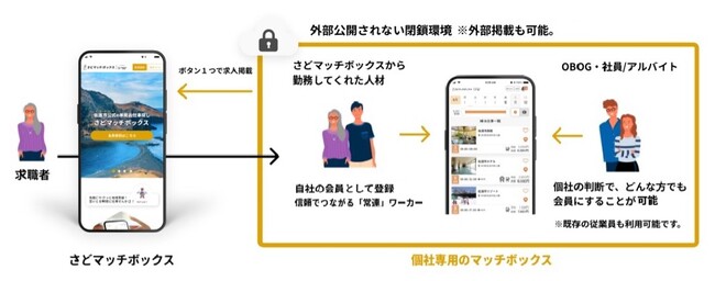 本事業ではマッチボックステクノロジーズがプラットフォームの提供および管理保守・運用を行い、企業はマッチボックステクノロジーズに利用申し込みを行います。利用企業による佐渡市内を就業地とした求人は「さどマッチボックス」およびアプリケーション上に集約され、佐渡市内の求人を全国から閲覧・応募することができるようになります(https://matchbox.jp/niigata/sado)。