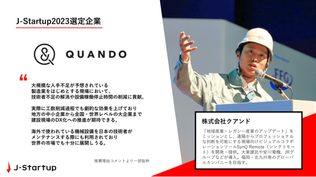 遠隔からプロフェッショナルな判断を可能にする現場向けビジュアルコラボレーションツールSynQ Remote(シンクリモート)を開発する福岡のスタートアップ株式会社クアンド(本社:福岡県北九州市、代表取締役CEO:下岡 純一郎)は、2023年4月6日、経済産業省のスタートアップ育成プログラムJ-Startup2023の選定企業となりました。