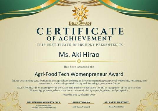 BELLA AWARDSは、アジアスモールビジネス連盟(ASBF)が主催する、農業、水産養殖、畜産、林業などの一次産業分野において、社会的・環境的課題に取り組む女性起業家を顕彰する国際的なアワードです。今回、全体で5部門にわたる厳正な審査が行われ、該当者なしの部門もある中、平尾は“満場一致”の高評価で日本代表に選出されました。