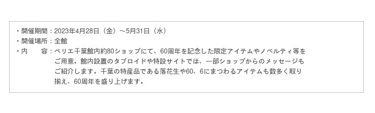 イベントやキャンペーンの内容は随時、「ペリエ千葉 開業60周年レター」にてご紹介してまいりますので、どうぞご期待ください。