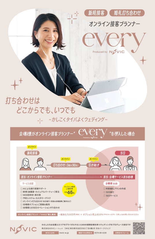 株式会社NOVIC(本社:東京都渋谷区、代表取締役:金田 昌彦)は、結婚式場向け新サービス「オンラインプランナー"every"」をリリースいたしました。