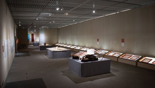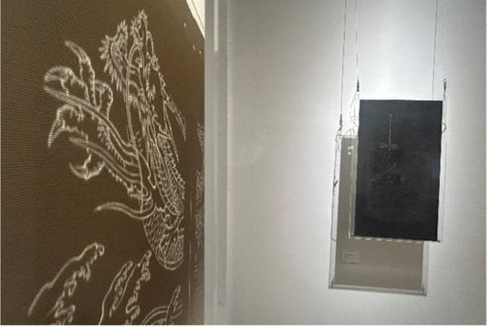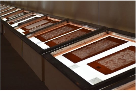 導入展示「染型職人の手業と歴史」では、立木氏の品々から厳選した染型を中心に、脈々と受け継がれてきた「小紋友禅 寫眞(しゃしん)型 立木紙型店」染型事業の世界が感じられる展示を目指しました。特にこだわったのは、染型の文様を美しくわかりやすく、リアルにご覧いただくために実際に布を染める際に使うオートスクリーン型枠を使用した内照型ディスプレー台の設計です。ここでは、鮫小紋8点、糸目4点、一刀彫18点の30点の生型を展示しました。また、染型の強度を上げ保持する紗張り(しゃばり)染型は、吊るし展示に照明を施すことで影絵として文様を壁面に映し出す手法を用いました。