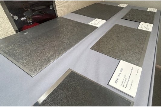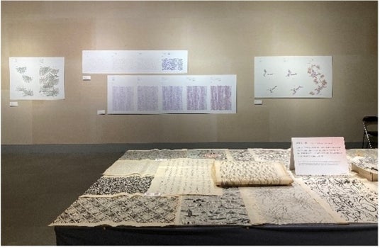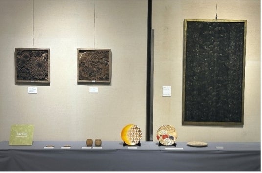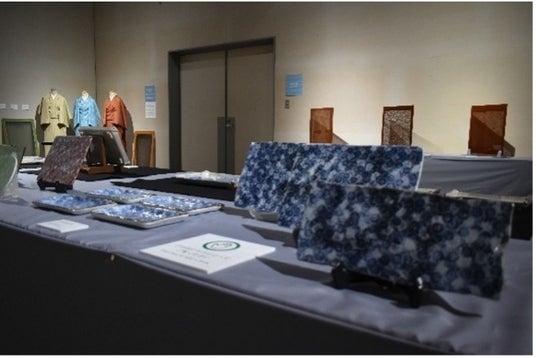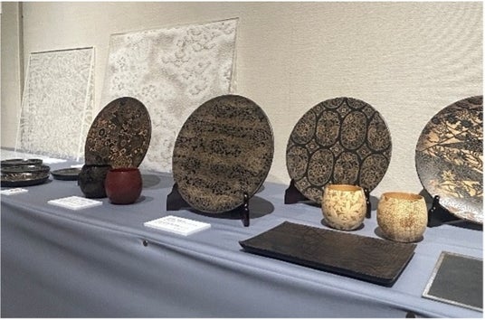 「立木コレクション 現代への展開」ゾーンでは、京都染型協同組合が保有する立木氏の染型文様デジタルアーカイブ(Tachiki collection 726柄)の公開とともに、布地はもちろん、陶器や漆器、革、金属、木、ガラス、アクリルなど、立木染型文様を現代の技術を用いて展開した様々な品物の展示を行いました。