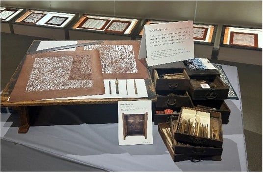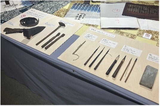 本展覧会は、昭和初期から平成にかけて京友禅の小紋型彫刻士として活躍した立木茂氏(1932-2020年)が残された1万枚以上の手彫り染型紙や型彫りの道具、図案、小紋帳、刷見本、図案発想のスケッチなどの貴重な資料が2021年11月に立木氏の奥様からのお声がけで京都染型協同組合に寄贈されたことをきっかけとして企画が始まりました。時代は立木氏現役時代の昭和初期から平成までのものであり、個人の歴史と共に戦前戦中戦後の染型職人の歴史を感じさせるものでした。