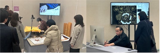 「職人の技術」ゾーンでは、伝統的な型彫りとデジタルトレースの技術を間近で大画面を通してご覧いただく実演展示や京都染型協同組合の技術をつくした作品展示、職人による子供たちのための型染体験の展示を行いました。