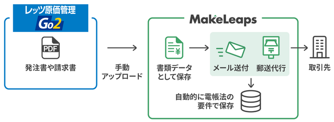 今回のサービス連携を利用することにより、「レッツ原価管理Go2」で作成した発注書や請求書などの書類データを「MakeLeaps」に連携し、書類のメール送付や郵送代行が可能となります。