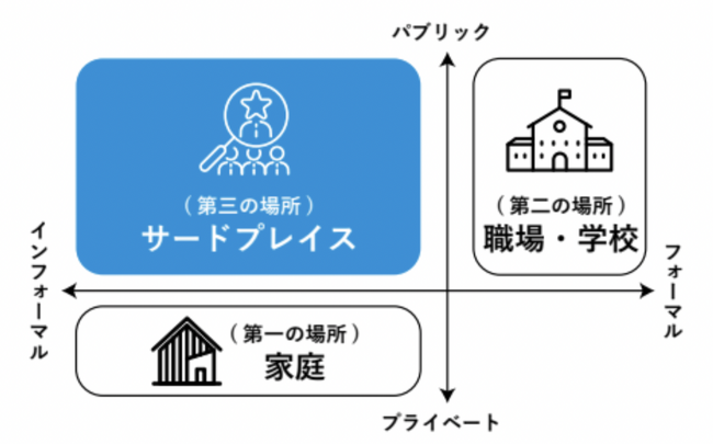 今は「目指す社会に向けて何を実現すべきか」という到達地点を考える時代となっています。サードプレイスとは、学校だけに多くの役割を求めるのではなく、学校の外で一人一人違う目標を持ち、それぞれのペースで主体的に学ぶことで多様な才能を開花させる第三の学びの場です。