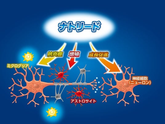 記憶力維持には、神経細胞とグリア細胞が重要な役割を果たしています。神経細胞は情報伝達の処理の役割を、グリア細胞は神経細胞を保護し栄養を運ぶなどの役割を担っていますが、加齢と共に減少します。ナトリードは神経細胞に栄養を与えるグリア細胞 の一つであるアストロサイトを増やすことで認知機能を維持することが報告されています。