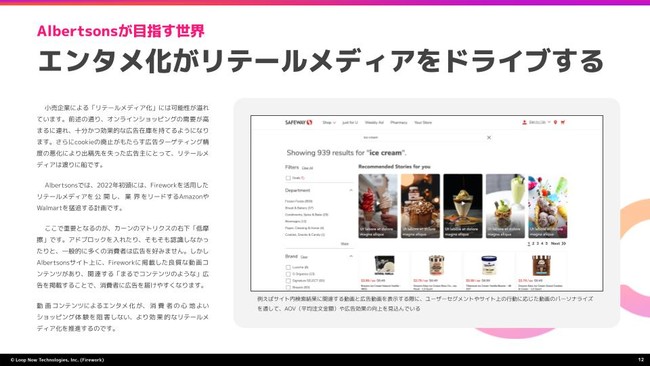 また同社の取り組みはエンターテイメントの提供に留まりません。動画の活用によって、自社プラットフォームのリテールメディア化も視野に入れています。リテールメディアは、今やAmazonの収益の一角を成すほどに成長した広告ソリューションで、多くの小売企業や広告代理店が注目する分野です。リテールメディア化による新たなマネタイズも、多くの企業にとって将来の光明になり得ると確信しています。