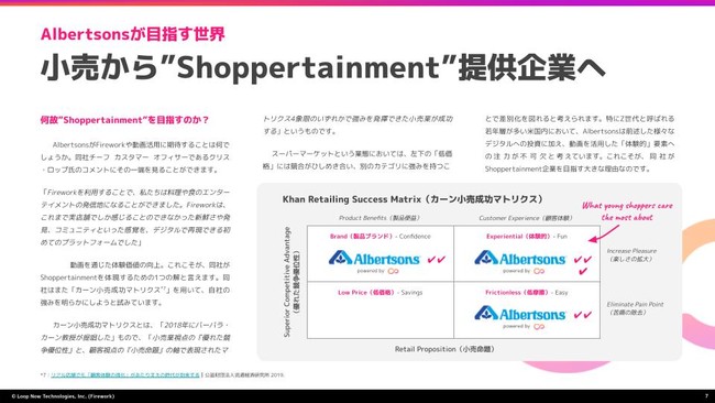 多くの人々が、かつての失われた楽しいお買い物体験を求めているにも関わらずです。こうした中、「食のエンターテイメント」を目指す、米大手小売企業のAlbetsons社が注目を集めています。同社は、Fireworkのショッパブル動画やライブコマースを活用し、オンラインショッピングの変革にチャレンジしています。