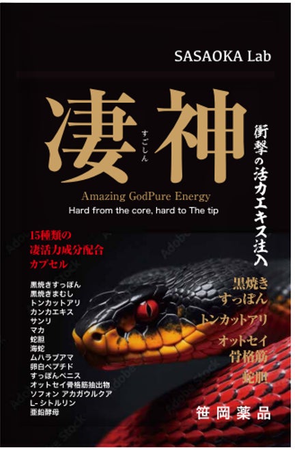笹岡薬品と老舗のすっぽん養殖場が共同開発した男性用活力サプリメント。すっぽんをはじめ、サソリ、マカ、蛇胆、海蛇、など15種類の活力成分を配合。男の自信を取り戻させる注目のサプリメントです。