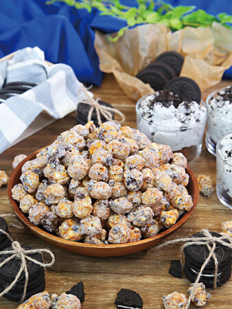 定番の「キャラメルクリスプ(TM)」に甘さをおさえたほろ苦いココアクッキーをたっぷりつけ、濃厚なホワイトチョコレートでコーティングした贅沢なレシピです。カリカリのキャラメル、ザクザクのクッキーとなめらかなホワイトチョコレートの異なる食感を楽しめるのもポイントです。
