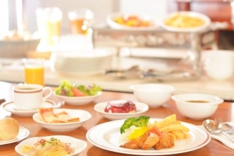 スクランブルエッグやサラダ、パン、ソーセージ、ヨーグルト、フルーツなどさまざまな種類のお食事をご用意しております。お好きなメニューをお好きな量でお召し上がりください。感染症拡大予防対策を施しながら、ブッフェスタイルでご提供いたします。