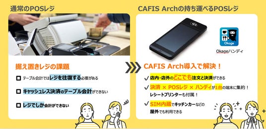飲食店のDXを支援するOkage株式会社(本社:東京都中央区、代表取締役CEO:内田 善久、以下「当社」)が提供するOkage ハンディアプリが株式会社NTTデータ(本社:東京都江東区豊洲、代表取締役社長:佐々木 裕)の取り扱うCAFIS Arch(R)の決済端末と連携いたしました。Okage ハンディアプリとの連携により、店内・店外のどこでも注文と決済ができる持ち運びができるPOSレジとしてスタッフがよりおもてなし業務に専念できる環境を提供します。