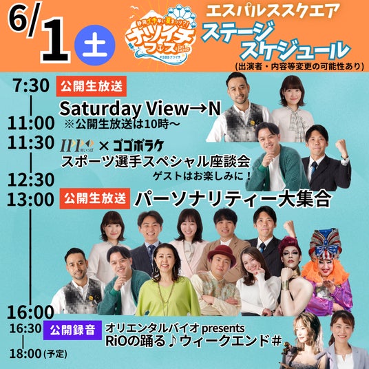 SBSラジオ(静岡放送)が、6月1日(土)・2日(日)、静岡イチ早い夏まつり!?「ナツイチフェス」をエスパルスドリームプラザ(静岡市清水区)(以下ドリプラ)で開催します。SBSラジオのパーソナリティーが大集合し、公開生放送を行うほか、人気お笑い芸人が出演するお笑いライブやアーティストが出演する音楽ライブも行います。