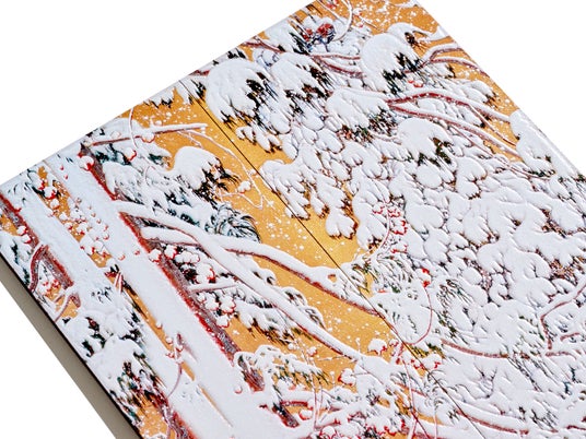 木の枝葉がしなるほど深く降り積もった大雪の迫力を表現するために、しっかりとした高さと重さのあるふくらみを盛って、雪を大胆に立体化しています。厳しい自然を生き抜く鳥たちの緻密な描写と色彩も忠実に再現することで、細部まで精緻に描かれた作品の静謐な世界観をポストカードに閉じ込めました。光瑤の切り開いた独自の世界観を感じることができる1枚です