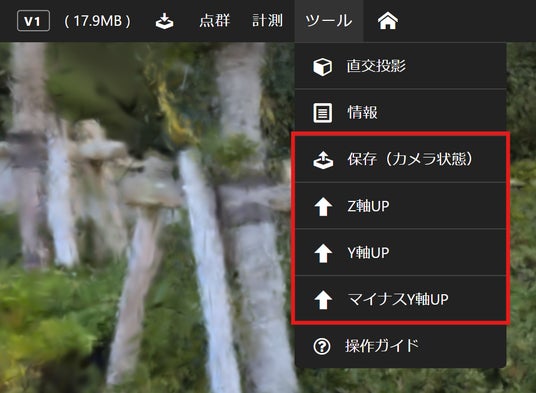 3DGSフォーマットでは鉛直方向(UP軸)が定義されていないため、簡単な操作で鉛直方向を調整およびクラウド保存できる仕組みを導入しました。同時に、カメラ視点の初期ビューも保存可能です。