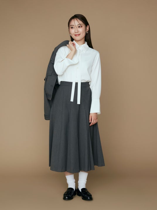 しなやかに女性らしく着こなせるシャツを目指して重なりあった襟、 やさしく広がる大きめのカフスをデザイン。 取り外しできる細めの共布タイが付いているので、 肩結び・リボン結びなど、自分らしい結び方で着こなして… マニッシュさを感じるAudireらしいドレスシャツです。