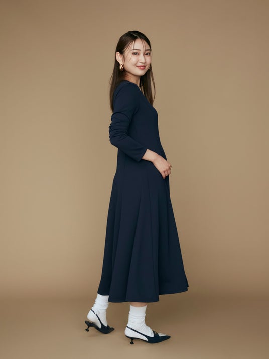 肌当たりの柔らかいカットソー生地をつかったシルエットで魅せるデイリードレス。 シンプルな中にも、左肩のボタンでアクセントを効かせました。 スウェットを着ているかのような心地よさと体をコンパクトに見せる切り替えで 「楽 (らく) して美しく」をかなえる1枚に。 この計算しつくされたシルエットをぜひ体感してください!
