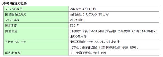 サーラ不動産株式会社(本社:愛知県豊橋市、代表取締役社長 赤間 真吾、以下「当社」)は、このたび東海旅客鉄道株式会社(本社:愛知県名古屋市、代表取締役社長 丹羽 俊介、以下「JR東海」)とJR東海不動産株式会社(本社:東京都港区、代表取締役社長 谷津 剛也、以下「JR東海不動産」)(以下、2社を合わせて「JR東海グループ」という。)が組成する不動産私募ファンド「JRCファンド第1号」(以下「本ファンド」)に、匿名組合出資を実行いたしましたのでお知らせいたします。