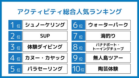 また、アクティビティランキングでランクインした「海釣り」も、地方都市や沿岸エリアが支持され、海上という地域の新たな魅力として注目されています。