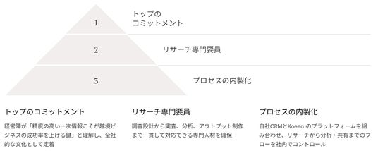 自社CRMや外部リサーチプラットフォームを活用しながら、社内で一貫してデータを扱える体制を構築。