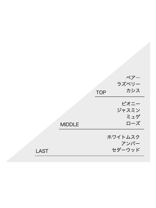 やわらかなピオニーに、優雅でエネルギッシュなジャスミンを効かせ、瑞々しく弾けるペアー、ラズベリー、カシスが寄り添うフルーティフローラルの香りに仕上げました。やさしい甘さのホワイトムスクや深みのあるアンバーのリッチな香りに包まれて、安らぎのひとときを。