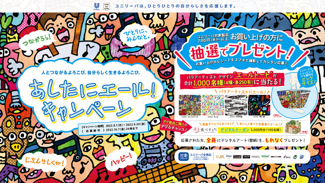 ユニリーバ・ジャパン・カスタマーマーケティング株式会社(本社東京都目黒区、代表取締役社長ジョイ・ホー)は、誰もが自分らしく生きることができ、一人ひとりを認めあえる社会をめざして、アートを通してたくさんの人とつながりたいパラアーティストの方々を応援する「あしたにエール!キャンペーン」を2022年8月1日(月)から実施いたします。