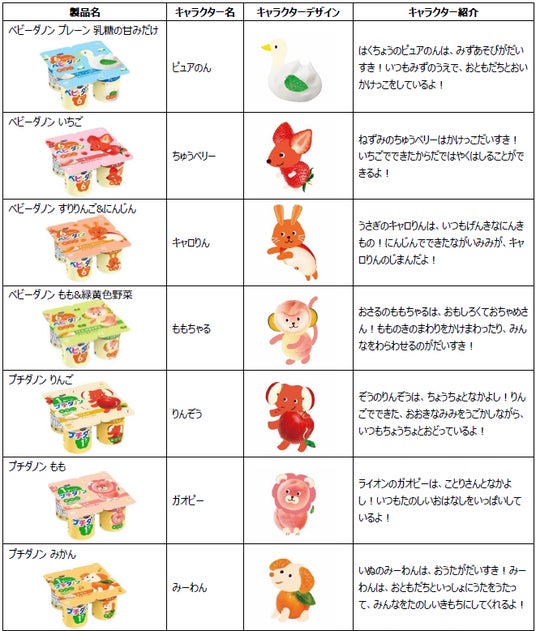 <「ベビーダノン」シリーズ、「プチダノン」シリーズの各製品キャラクターの一覧>