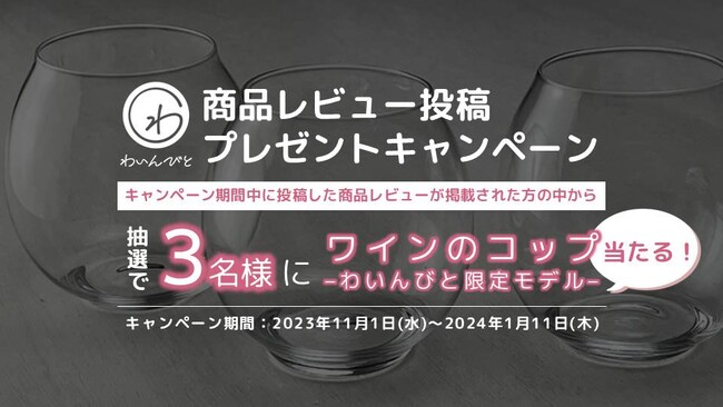 本キャンペーンは、わいんびとから商品をご購入いただいたお客様限定のキャンペーンです。本キャンペーン期間中に、わいんびとに投稿した商品レビューが掲載された方の中から抽選で3名様に「ワインのコップ - わいんびと限定モデル」をプレゼントいたします。